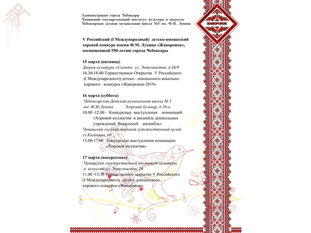 Шупашкарта пуш уйӑхӗн 15-18-мӗшӗсенче хор музыкин черетлӗ уявӗ иртет. Ача-пӑчапа ҫамрӑксен пӗтӗм Раҫҫейри V (Пӗтӗм тӗнчери I) «Жавронок» (чӑв. Тӑри) хор конкурсӗ Ф.М. Лукин ячӗпе хисепленет. Ӑна хальхипе пиллӗкмӗш хут йӗркелеҫҫӗ. Икӗ ҫулта пӗрре пулакансксер вӑхӑтӗнче арҫын ачасен хорӗсем кӑҫал пуҫласа ӑмӑртӗҫ.