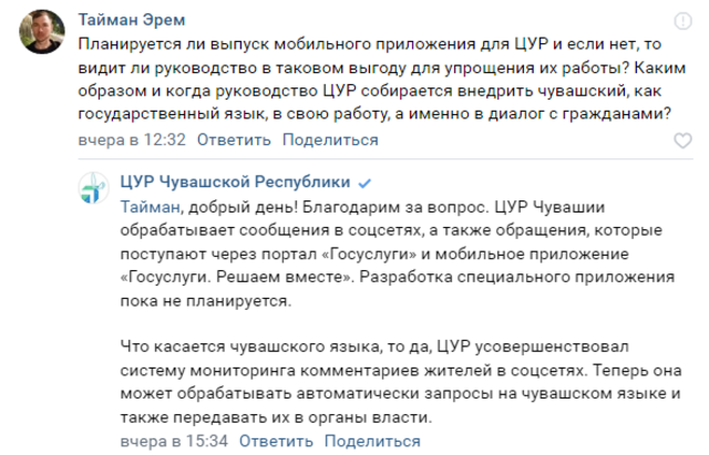 Чӑваш Енри Республика управленийӗн центрӗн тӗнче тетелӗнчи ушкӑнне ӗнер Тайман Эрем ятлӑ ҫамрӑк чӑваш чӗлхипе ҫыхӑннӑ ыйту ӑсатнӑ. Вӑл центр ертӳҫисем чӑваш чӗлхипе патшалӑх чӗлхи евӗр хӑҫан усӑ курма пуҫлӗҫ тесе кӑсӑкланнӑ май республикӑра пурӑнакансемпе диалога чӑвашла йӗркелесе ярасси пирки пӗлесшӗн пулнӑ.