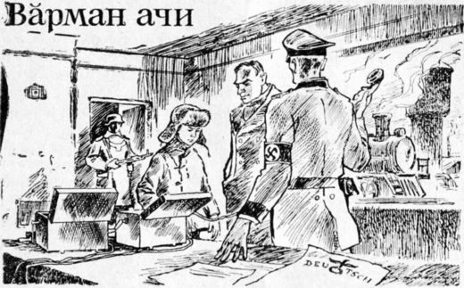 ...Вася фашистсем хурал тăман урамсем тăрăх станцие тухрĕ. Маневр тăвакан пĕчĕк пăравус, çинçе сассипе çухăртса, ун умĕнченех иртсе кайрĕ. Вася маларах утрĕ те вагон айне чăмрĕ, вăрăм составсем хушшине тухса тăчĕ.
