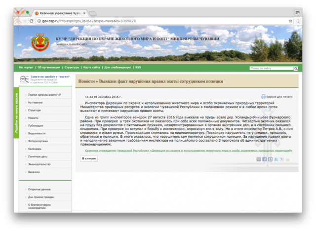 Ҫурла уйӑхӗн 27-мӗшӗнче маларах асӑннӑ дирекци инспекторӗсем Вӑрнар районӗнчи Услантӑр Енӗш ялӗ патӗнче пӗве патӗнчи сунарҫӑсене тӗрӗсленӗ. Вӗсенчен пӗрин сунар пӑшалне йӗрке хуралҫисем патӗнче регистрациленине ҫирӗплетсе паракан хут пулман. Ҫитменнине вӑл ӳсӗррине асӑрханӑ. Хӗрӗнкӗ пуҫпа пӑшал ҫакса тухни саккуна пӑсни шутланать. Хутсем тӗрӗслекен инспекторпа хайхи арҫын хирӗҫме тытӑннӑ, инспектора шыва тӗксе ӳкернӗ. Хӑйне чӑрсӑр тытакан ҫын лӑпланманнине кура инспекторсем полицейскисенченех пулӑшу ыйтнӑ. Инспекторпа кӗрешекен сунарҫӑ йӗрке хуралҫи пулни ҫиеле тухнӑ.