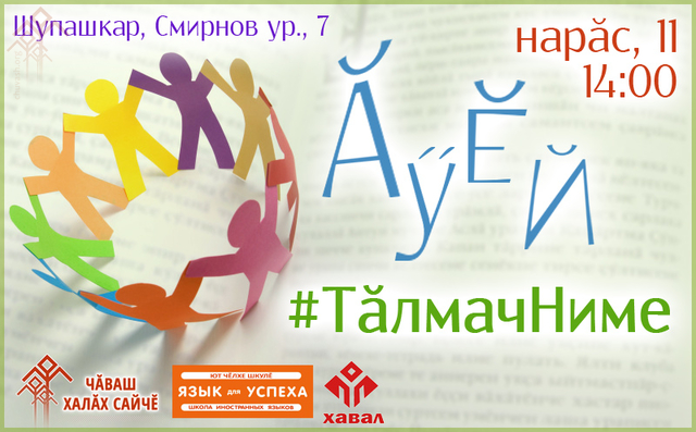 Чӑваш халӑх сайчӗ, «Ӑнӑҫу чӗлхи» ют чӗлхесен шкулӗ, «Хавал» тата «Ирӗклӗх» пӗрлешӳсем тӑван чӗлхене юратакансене, ӑна аталантарма пулӑшма хатӗррисене нимене чӗнеҫҫӗ. «#ТӑлмачНиме» ят панӑ мероприяти Шупашкар хулинчи Смирнов урамӗн 7-мӗш ҫуртӗнче (Благовещени микрорайонӗ) иртӗ, 14 сехетре пуҫланӗ.