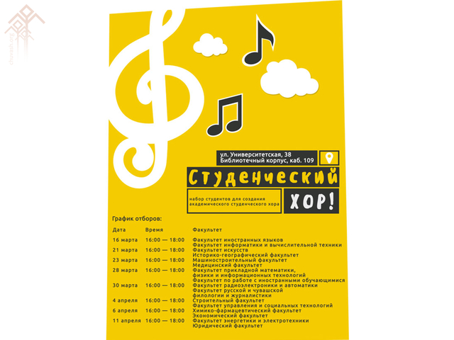 Хора лекес шухӑшлӑ хитре сасӑллӑ хӗрсемпе каччӑсене пуш уйӑхӗн 23-мӗшӗнчен пуҫласа ака уйӑхӗн 11-мӗшӗччен кашни ытларикунпа кӗҫнерникун 16 сехетрен пуҫласа 18 сехетчен Шупашкарти Университет урамӗнчи 38/III ҫуртри III-109 аудиторире юрлаттарса пӑхӗҫ.