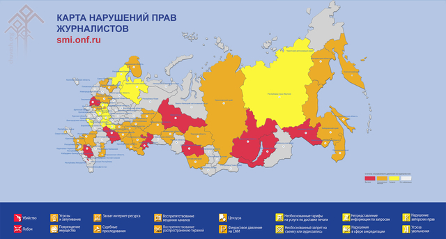 Пирӗн республика сарӑ хӗрлӗ тӗспе уйӑрнӑ регионсен йышне лекнӗ. Журналистсен правине уйрӑмах пӑсакан регионсем — Иркутск облаҫӗ, Буряти, Тинӗсҫум крайӗ, Краснодар крайӗ, Пенза облаҫӗ.
