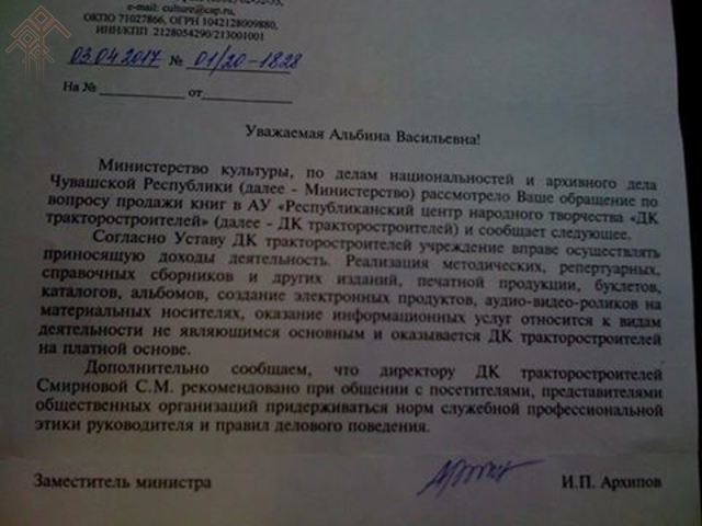 Хӑйӗн чун ыратӑвӗпе сӑвӑҫ ЧР Культура министерствине ҫитнӗ. Халӗ вӑл унтан хурав илнӗ. Ҫавна А. Юрату Фейсбукри хӑйӗн страницинче вырнаҫтарнӑ. Хуравра аренда укҫи ыйтнинче ним начарри те ҫуккине пӗлтернӗ. «Сӑмахсӑрах...», — ҫырса хунӑ Альбина Юрату хуравран тӗлӗннине палӑртса.