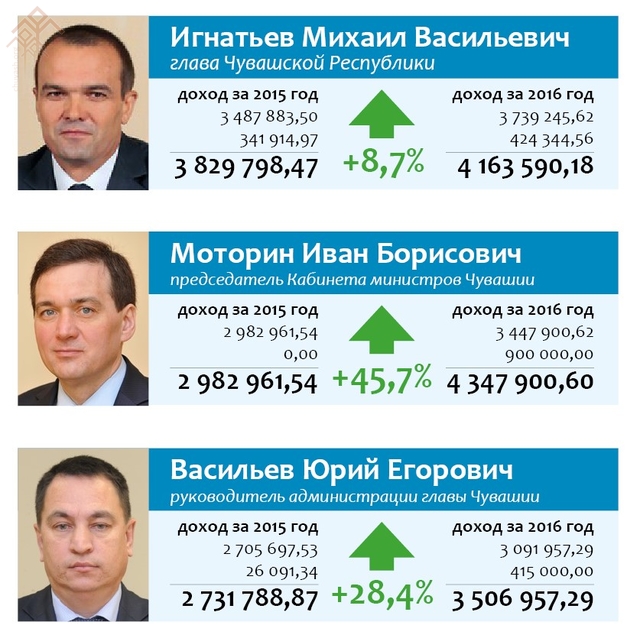 ЧР Элтеперӗн администрацийӗн ертӳҫи Юрий Егоров пӗлтӗр 3,51 миллион тенкӗ ӗҫлесе илнӗ. Тӗп суйлав комиссийӗн пуҫлӑхӗ Александр Цветковӑн тупӑшӗ 3,5 миллион тенкӗпе танлашнӑ. Финанс министрӗн Светлана Енилинӑн тупӑшӗ – 2,85 миллион тенкӗ. Вӑл пӗлтӗрхинчен 255 пин тенкӗ сахалрах ӗҫлесе илнӗ.