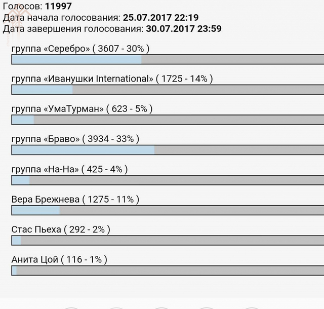 Аса илтерер: сасӑлава онлайн-режимра утӑ уйӑхӗн 25-30-мӗшӗсенче ирттернӗ. Хула ҫыннисене 8 артистран е ушкӑнран пӗрне суйлама ирӗк панӑ: «Серебро», «Иванушки International», «УмаТурман», «Браво», «На-На» ушкӑнсем тата Вера Брежнева, Стас Пьеха, Анита Цой юрӑҫсем.