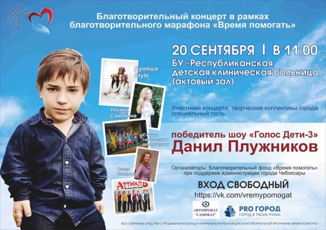 Шупашкарта «Время помогать» (чӑв. Пулӑшма вӑхӑт) ыр кӑмӑллӑх марафонне ирттерсе паллӑ хӑна сцена ҫине тухмалла. Чӑваш Ен тӗп хулине «Голос. Дети» (чӑв. Сасӑ. Ачасем) Данил Плужников килмелле. Унӑн тӗп тӗллевӗ — ыр кӑмӑллӑх концертне хутшӑнасси. Унӑн пултарулӑхне курма тата итлеме чирлекен ачасем пултараҫҫӗ.
