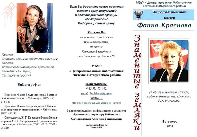 Паллӑ спортсменка юбилейӗ тӗлне Патӑрьел районӗнчи тӗп вулавӑш «Фаина Краснова» буклет хатӗрленӗ. Унта спортсменӑн кӗске биографине, спортри ҫитӗнӗвӗсене, сӑн ӳкерчӗкӗсене, унпа паллаштаракан статьясене кӗртнӗ.