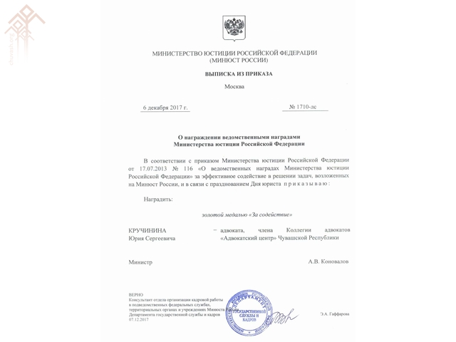 Чӑваш Енре этем правине хӳтӗлекен уполномоченнӑй пулса ӗҫленӗ, каярах «Правозащитный бастион» (чӑв. Правӑна хӳтӗлекен бастион) ятлӑ коммерцилле мар организаци йӗркеленӗ Юрий Кручинина Раҫҫейӗн Юстици министерстви «За содействие» (чӑв. Пулӑшнӑшӑн) ылтӑн медальпе наградӑлама йышӑннӑ. Кун пирки республикӑри паллӑ юрист Фейсбукра ӗнер пӗлтернӗ.