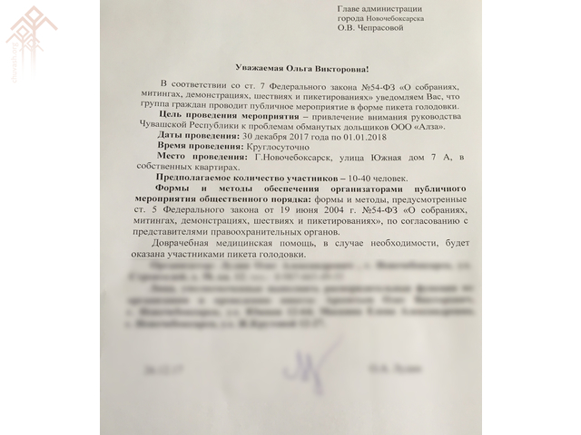 Выҫӑ тытасси пирки Ҫӗнӗ Шупашкар хула администрацийӗн пуҫлӑхне Ольга Чепрасовӑна хут ҫырса систернинчен 10 ҫынтан пуҫласа 40 ҫын таран ҫак акцие хутшӑнасси паллӑ. Апатсӑр ларма вӗсем раштав уйӑхӗн 30-мӗшӗнче тытӑнасшӑн та кӑрлачӑн 1-мӗшӗ таран ҫимесӗр чӑтасшӑн.