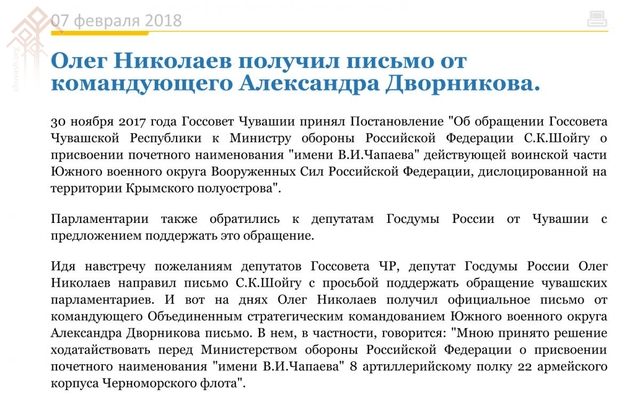 В.И. Чапаев ятне парассипе ҫыхӑннӑ ыйтупа Кӑнтӑр ҫар округӗн командующийӗ Александр Дворников РФ Патшалӑх Канашӗн депутатне Олег Николаева хуравланӑ. Ҫакна Фейсбукра Олег Николаев нарӑсӑн 7-мӗшӗнче ҫырнӑ.