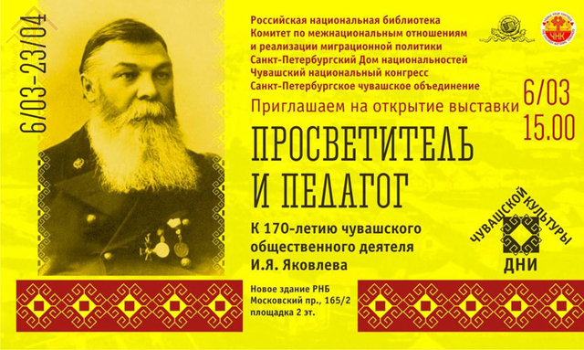 Питӗрти чӑвашсен пӗрлешӗвӗ, Ленинград облаҫӗнчи чӑвашсен культура обществи, Раҫҫейӗн наци вулавӑшӗ, Питӗрти национальноҫсен ҫурчӗ пӗрле пулса «Педагог и просветитель: к 170 – летию чувашского общественного деятеля Ивана Яковлевича Яковлева» (чӑв. Педагог тата ҫутта кӑларакан: чӑваш халӑхӗн хастарӗ Иван Яковлевич Яковлев ҫуралнӑранпа 170 ҫул ҫитнине халаласа) курав йӗркеленӗ. Вӑл Питӗрти Мускав проспектӗнчи 165/2-мӗш ҫуртра 15 сехетре уҫӑлӗ. Куравра Чӑваш Ен ҫӗрӗ ҫинче ҫуралнӑ, халӗ Питӗрте пурӑнакан Александр Федоров художник ӗҫӗпе те паллашма май килӗ.