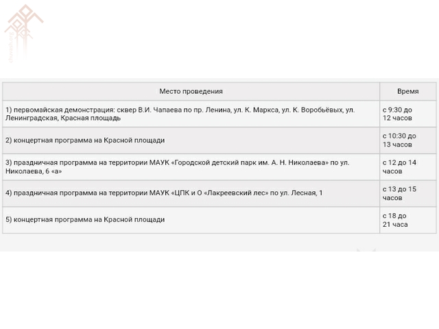 Ыран Шупашкар хулинче Ҫуркуннепе Ӗҫ уявӗ май массӑллӑ мероприятисем иртмелле. 9 сехет те 30 минутран пуҫласа 12 сехетчен хула урамӗпе демонстраци иртӗ. Колоннӑна тӑнисем В.И. Чапаев скверӗ патӗнчен тытӑнса Ленин проспекчӗпе, Карл Маркс, Воробьев композиторсен урамӗпе Хӗрлӗ лапама утса анӗҫ. 10 сехет те 30 минутран 13 сехетчен тата 18 сехетрен 21 сехетчен Хӗрлӗ лапамра концерт кӑтартӗҫ. Каҫхине «Стрелки» ушкӑн сцена ҫине тухассине Чӑваш халӑх сайчӗ пӗлтерсе ӗлкӗрчӗ-ха.