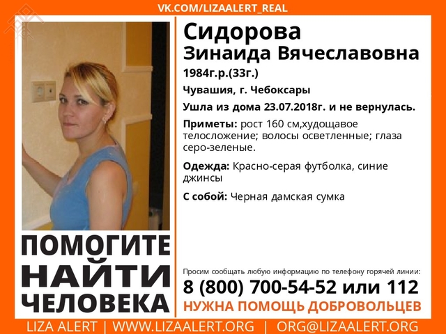«Лиза Алерт» шыравпа ҫӑлав отрячӗ Шупашкарта пурӑнакана Зинаида Вячеславовна Сидоровӑна шырать. Тӑватӑ ача амӑшӗ, 1984 ҫулта ҫуралнӑскер, килтен тухса кайнӑ та таврӑнман.