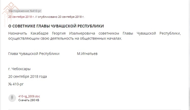 Малашне ҫак тивӗҫе Кабадзе Георгий Изалмерович пурнӑҫлӗ. Хушӑва паян Михаил Игнатьев алӑ пусса ҫирӗплтенӗ.