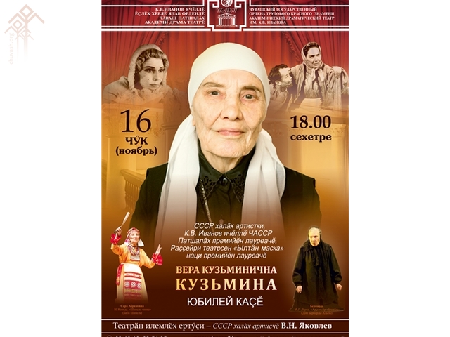 К.В.Иванов ячӗллӗ Чӑваш патшалӑх академи драма театрӗн сцени ҫинче халӑха ҫичӗ теҫетке ҫул ытла килентерекен СССР халӑх артистки Вера Кузьмина паян 95 ҫул тултарать. Тӗлӗнмелле те, хӑпартланмалла та, Турра та тав тумалла — чӑваш сценин ҫутӑран та ҫутӑ ҫӑлтӑрӗ юбилей каҫне сцена ҫинче халӑхпа уявлӗ. Программа, сӑмах май, Чӑваш патшалӑх академи драма театрӗнче 18 сехетре пуҫланӗ. Унта Вера Кузьмина вылянӑ спектакльсенчи сыпӑксем, саламсем пулӗҫ.