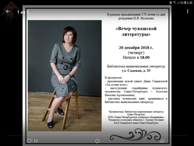 Питӗрти Наци литературисен вулавӑшӗнче (вӑл асӑннӑ хулари Пахча урамӗнчи 33-мӗш ҫуртра вырнаҫнӑ) «Чӑваш литературин каҫӗ» иртӗ. Вӑл 18 сехетре пуҫланмалла. Мероприятие Иван Яковлев ҫуралнӑранпа 170 ҫул ҫитнине халалланӑ.
