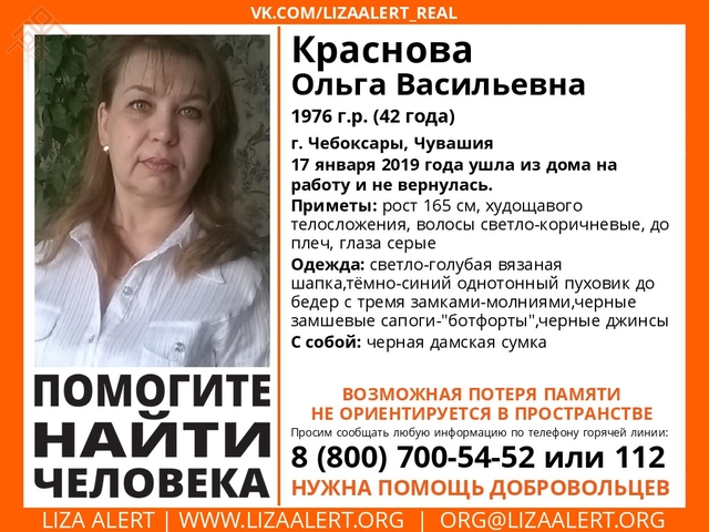 «Лиза Алерт» шыравпа ҫӑлав отрячӗн хастарӗсем Шупашкарта пурӑнакан 42 ҫулти хӗрарӑма шыраҫҫӗ. Ольга Васильевна Краснова кӑрлач уйӑхӗн 17-мӗшӗнче килтен ӗҫе тухса кайнӑ та тек таврӑнман. Хӗрарӑм хушӑран ӑс-тӑнӗпе арпашӑнма пултарать, ҫавна май хӑй ӑҫта пулнине пӗлмест.