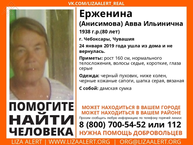 Шупашкарта пурӑнакан Авва Ильинична Ерженинӑна (Анисимова) тӑваттӑмӗш кун шыраҫҫӗ. 80 ҫулти кинемей килтен кӑрлач уйӑхӗн 24-мӗшӗнче тухса кайнӑ та таврӑнман. Ӑна «Лиза Алерт» ҫӑлавпа шырав отрячӗн хастарӗсем те шыраҫҫӗ.