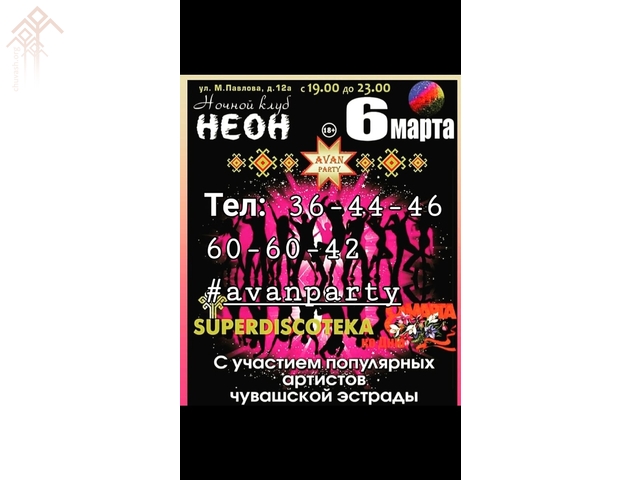 Паян, пуш уйӑхӗн 6-мӗшӗнче, «Неон» каҫхи клубра черетлӗ «Аван-party» дискотеки иртӗ. Унта мӗнпур ҫамрӑк йыхравлаҫҫӗ! «Superташлаҫҫи» 19 сехетрен пуҫласа 23 сехетччен пырӗ.