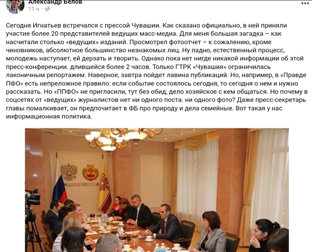 Ӗнер, юпа уйӑхӗн 15-мӗшӗнче, Чӑваш Ен Элтеперӗ Михаил Игнатьев прессӑра ӗҫлекенсемпе тӗл пулнӑ. Ҫакна эпир республикӑри ятлӑ-сумлӑ журналист Александр Белов Фейсбукра хыпарлани тӑрӑх пӗлтӗмӗр. Вӑл вара — Чӑваш Енӗн влаҫ органӗсен официаллӑ порталӗнче ҫырнинчен.