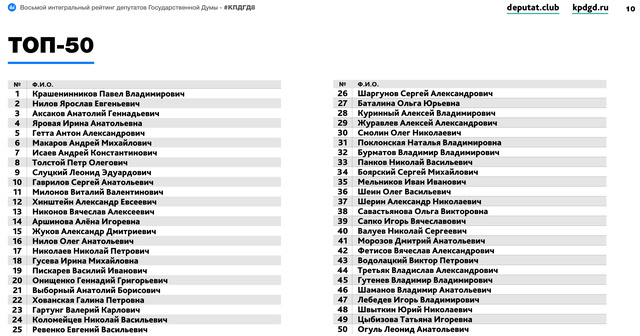 Танлаштарӑма хатӗрлекенӗсем — Дмитрий Гусев тата Алексей Мартынов политологсем. Мускавра вӗсем парламентарисен уссине палӑртакан саккӑрмӗш интеграллӑ рейтинг йӗркеленӗ. ТОП-50 танлаштарӑма «Тӗрӗслӗхшӗн Раҫҫей» парти пайташӗ Анатолий Аксаков тата «Пӗрлӗхлӗ Раҫҫей» партин пайташӗ Алена Аршинова лекнӗ. Анатолий Аксаков — ҫӳлтен виҫҫӗмӗш йӗркере, Алена Аршинова — 14-мӗшӗнче.