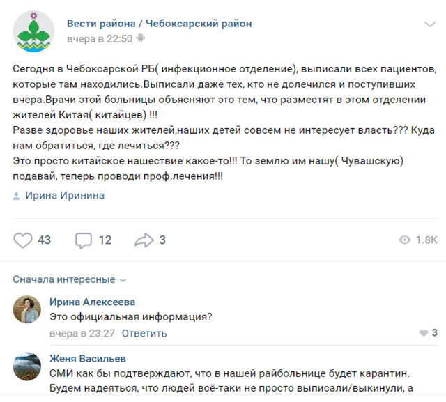 «Паян Шупашкар районӗнчи пульницӑри инфекци уйрӑмӗнчен мӗнпур пациента кӑларса ячӗҫ. Ӗнер ҫеҫ вырттарнисене те, сипленсе пӗтменнисене, кӑларчӗҫ. Пульницӑри врачсем ҫакна кунта Китай ҫыннисене вырттарассипе сӑлтавлаҫҫӗ», — ҫакӑн пек хыпарланӑ ҫӗркаҫ, нарӑс уйӑхӗн 5-мӗшӗнче, «Контактра» халӑх ушкӑнӗнчи «Вести района / Чебоксарский район» пабликра.