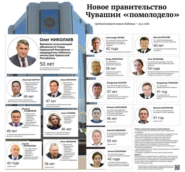 Чи ҫамрӑкки — Алла Салаева. Вӑл 40 ҫулта. Ӑна ЧР Министрсен Кабинечӗн Ертӳҫин ҫумӗн тивӗҫӗсене пурнӑҫлама шанчӗҫ. Сывлӑх сыхлав министрӗн тивӗҫне пурнӑҫлакан Владимир Степанов — 41 ҫулта. 42 ҫултисем — ял хуҫалӑх министрӗн тивӗҫӗсене пурнӑҫлакан Сергей Артамонов, строительство министрӗн тивӗҫӗсене пурнӑҫлакан Александр Героев, ӗҫ министрӗн тивӗҫӗсене пурнӑҫлакан Алена Елизарова. Чи асли — спорт министрӗн тивӗҫсене пурнӑҫлакан Виктор Богаратов. Вӑл — 61 ҫулта. Хӑй Олег Николаев, сӑмах май, 50 ҫулта.
