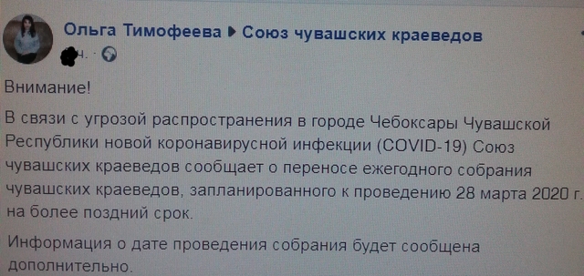 «Шупашкарта ҫӗнӗ коронавирус инфекцийӗ (COVID-19) сарӑлас хӑрушлӑх пуртан Чӑваш Енри таврапӗлӳҫӗсен пухӑвӗ каярах иртӗ», — ҫапларах ҫырса хунӑ вӑл хыпарта.
