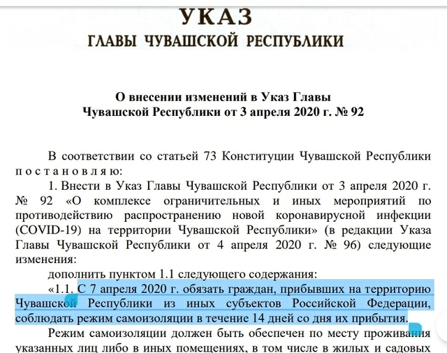 Чӑваш Ене ҫӗршывӑн тӗрлӗ регионӗнчен килекен ҫынсен ик эрне килте лармалла. Ҫапла йышӑнӑва республикӑн Элтеперӗн тивӗҫӗсене вӑхӑтлӑх пурнӑҫлакан Олег Николаев паян, ака уйӑхӗн 7-мӗшӗнче алӑ пуснӑ. Ку йышӑну паян вӑя кӗнӗ. Апла пулсан сӑмах паянтан пирӗн тӑрӑха урӑх хуласенчен килекенсем пирки пырать. Ют регионтан пирӗн республикӑна килекенсене ик эрне е килте, е дачӑра пурӑнмалла.
