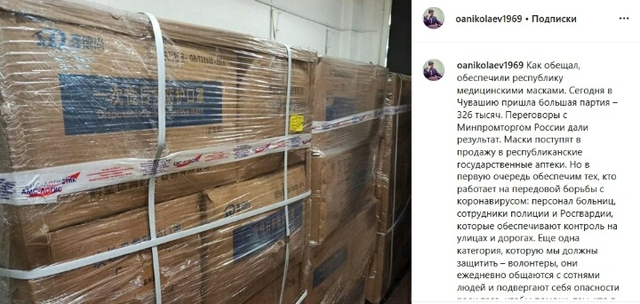 «Малтан шантарнӑ пекех республикӑна медицина маскисемпе тивӗҫтертӗмӗр. Паян Чӑваш Ене пысӑк парти –326 пин – килчӗ. Раҫҫейӗн Промышленность министерствипе калаҫу ирттернин усси пулчӗ», – тесе ҫырнӑ Олег Николаев.