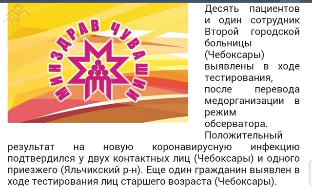 vk.com/wall-181162659_9516 — Чӑваш Енре кӑшӑлвируслӑ пӗрремӗш ҫын вилнӗ. 79 ҫулхи хӗрарӑм.
