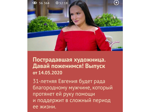Шупашкар хулинчи Евгения Волкова Пӗрремӗш каналпа кӑтартакан «Давай женимся» кӑларӑма хутшӑннӑ. Вӑл ӳкерӗннӗ передачӑна «Пострадавшая художница» ят панӑ. Кӑларӑма ҫу уйӑхӗн 14-мӗшӗнче эфира кӑларнӑ.