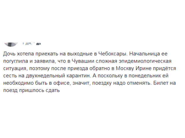 Фейсбукра пӗри ҫырнӑ тӑрӑх, унӑн Мускавра ӗҫлекен хӗрне пуҫлӑх Чӑваш Ене ярасшӑн пулман. Вӑл ӑна пирӗн тӑрӑхра эпидемиологи лару-тӑрӑвӗ начар, апла пулсан ҫӗршывӑн тӗп хулине таврӑнсан икӗ эрне карантинта ларма тивӗ тесе асӑрхаттарнӑ.