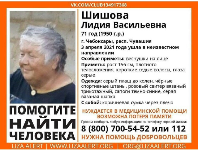 Шупашкар хулинчи йӗрке хуралҫисем 71 ҫулти хӗрарӑма шыраҫҫӗ. Шалти ӗҫсен министерствин Шупашкарти управленийӗнче пӗлтернӗ тӑрӑх, Лидия Шишова килтен ака уйӑхӗн 3-мӗшӗнче тухса кайнӑ.