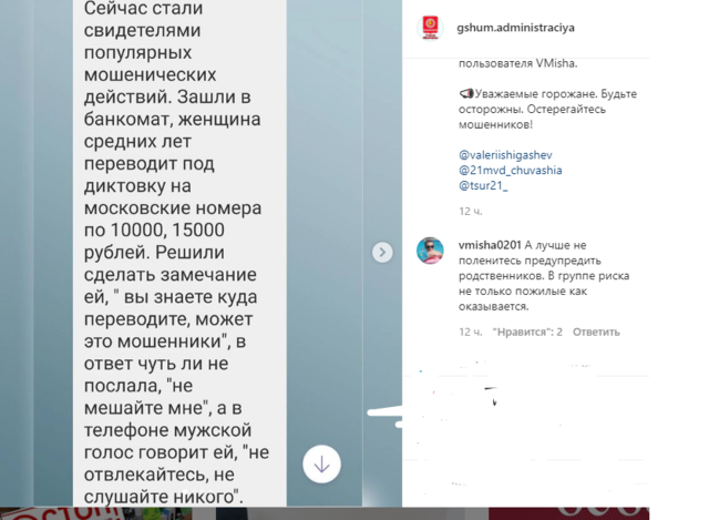 Ҫӗмӗрле хулинче вӑтам ҫулсенчи пӗр хӗрарӑм банкоматра Мускав номерӗсем ҫине 10 пин тата 15 пин тенкӗшер куҫарнӑ. Ҫавна асӑрахакан тупӑннӑ. Хӗрарӑма асӑрхаттарасан лешӗ тарӑхсах кайнӑ. Апла пулин те тимлӗ ҫын хӗрарӑма пӑрахса утман, йӗрке хуралҫисене чӗнсе илнӗ. Лешӗсене те хӗрарӑма айван утӑмран тытса чарма ҫӑмӑл пулман. Кайран та вӑл шанмасӑртарах тӑнӑ, иккӗленнӗ. Нумай сумма куҫарса ӗлкӗреймен те, анчах «кӗмӗлӗн» пӗр пайне ултавҫӑсене куҫарса панӑ.
