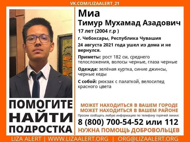Тимур Мухамад Азадович Миа, 2004 ҫулта ҫуралнӑскер, ҫурла уйӑхӗн 24-мӗшӗнче рюкзак, палатка йӑтнӑ та хӗрлӗ велосипед ҫине ларса кайнӑ. Унтанпа ӑна никам та курман.