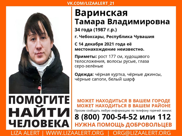 Ҫухалнӑ 34 ҫулти хӗрарӑма «Лиза Алерт» шыравпа ҫӑлав отрячӗн хастарӗсем шыраҫҫӗ. Тамара Варинская ҫухалнине ШӖМ те ҫирӗплетет.