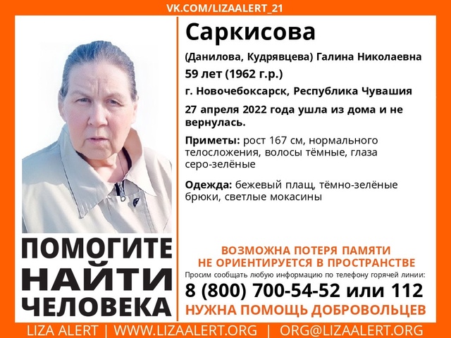 Галина Саркисова (Данилова, Кудрявцева) 59 ҫулта. Вӑл килтен ака уйӑхӗн 27-мӗшӗнче тухса кайнӑ. Тек ӑна никам та курман.