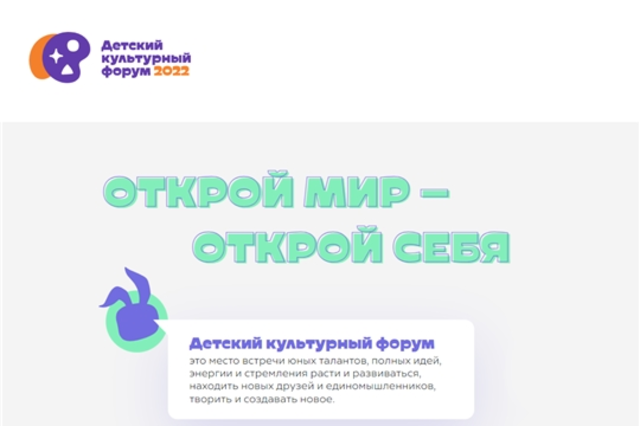Раҫҫейӗн кашни регионӗ хутшӑнакан форума пирӗн тӑрӑхран 12-17 ҫулсенчи 7 ача кайса курӗҫ. Республика делегацийӗн йышне Шупашкарти 1-мӗш музыка шкулӗнчи, Шупашкарти 1-мӗш ӳнер шкулӗнчи, Ҫӗнӗ Шупашкарти ача-пӑчан ӳнер шкулӗнчи, Елчӗкри ача-пӑча ӳнер шкулӗнчи, Шупашкарти 2-мӗш гимназири, Культура колледжӗнчи вӗренекенсем кӗнӗ. Вӗсем музыка, хореографи, театр, ӳнер искусстви енӗпе хӑйсен пултарулӑхне кӑтартӗҫ.