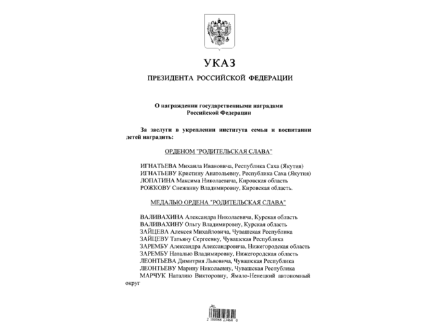 РФ Президенчӗ Владимир Путин Раҫҫейри нумай ачаллӑ ҫемьесене «Ашшӗ-амӑшӗн мухтавӗ» орденпа тата орден медалӗпе чысласси пирки хушу алӑ пуснӑ. Ҫак списокра Чӑваш Енри ҫемьесем те пур.