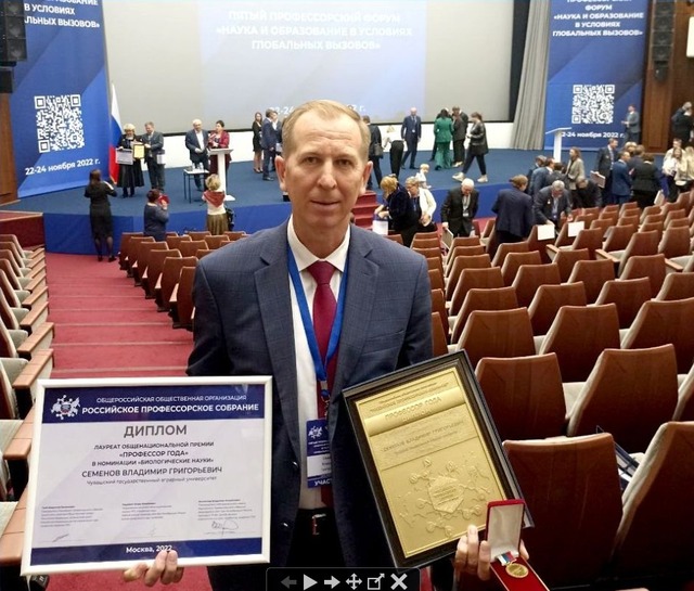 Чӑваш Енри преподаватель Владимир Семенов Пӗтӗм нацин «Ҫулталӑк профессорӗ» преминче «Биологи ӑслӑлӑхӗсем» номинацире ҫӗнтернӗ. Ӑна ӗнер Мускавра чысланӑ.