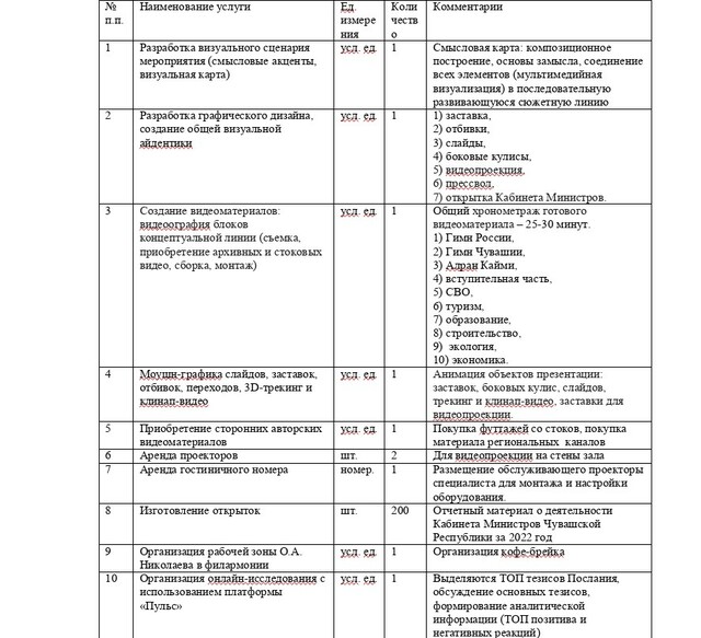 Мероприяти йӗркелӳҫин визуаллӑ сценари, графика дизайнӗ хатӗрлемелле, автор видеоматериалӗсене туянмалла, проекторсемпе хӑна ҫурчӗн номерне тара илмелле, отчет материалне кӗртнӗ 200 открытка тумалла. Ҫавӑн пекех кофе-брейк йӗркелемелле, 25-30 минута тӑсӑлакан видеоматериал тумалла.