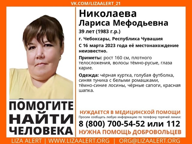 Красноармейски районӗнчен Шупашкарти пульницӑна сипленме килнӗ Лариса Мефодьевна Николаева пуш уйӑхӗнче ҫухалнӑ. Ун чухне вӑл пульницӑран тухнӑ, текех ӑна никам та курман.