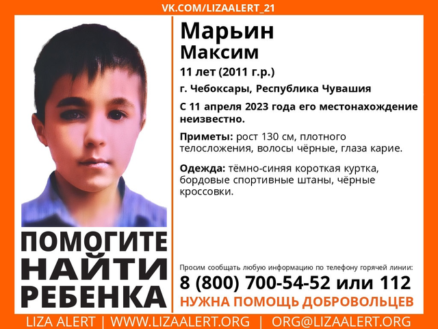 Шупашкарта 11 ҫулти арҫын ачана шыраҫҫӗ. Максим Марьин ӗнер ҫухалнӑ. «Лиза Алерт» хастарӗсем ӑна шырама тухнӑ.