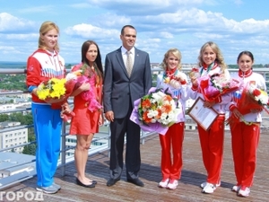 Ӗнер, утӑн 18-мӗшӗнче, 14:00 сехетре правительство ҫуртӗнче Республика Элтеперӗ Михаил Игнатьев Универсиадӑран тӑван кӗтӗсе ҫӗнтерӳпе таврӑннӑ спортсменкӑсемпе тӗл пулнӑ. Йышӑннӑ йӑла тӑрӑх Михаил Васильевич спортсменкӑсене: Екатерина Красновӑна, Ирина Юманова, Кристина Савицкая, Наталья Пучковӑна, Алина Прокопьевӑна пуш аллӑн кӗтсе илмен, хӗрсене укҫа-тенкӗ енчен хавхалантарас тесе ятарлӑ сертификатпа чысланӑ. Ҫӗнтерҫӗсене саламлама физкультура, спорт тата туризм министрӗ Сергей Мельников, спортменсенкӑсен тренер-вӗрентекенӗсем килсе ҫитнӗ. Чи малтанах Михаил Игнатьев хӗрсенчен вӗсен сывлӑхӗ ҫинчен ыйтса пӗлнӗ, ҫӗнсе илнӗ медальсем ҫинчен те сӑмах хускатнӑ.
