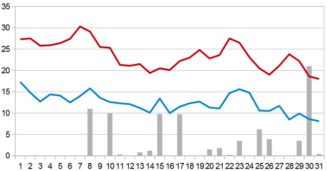 Пӗрремӗш ҫурринче шӑрӑх ҫанталӑк тӑрӗ, ҫумӑр сахал ҫӑвӗ. Ҫурлан 8-мӗшӗнченпе ҫумӑр ҫукалама тытӑнӗ те уйӑх вӗҫӗчченех хушӑран ҫукалӗ.