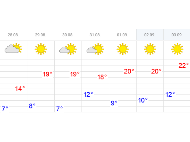 Эрне варринче 18-23 градус ӑшӑ пулӗ. Авӑнӑн 1-мӗшӗнче уяр пулӗ, термометр 23-25 градус таран кӑтартӗ. Канмалли кунсенче вара 28 градус таранах ӑшӑтӗ. Ҫӗрлесерен те 13-14 градус пулӗ.