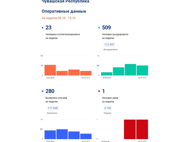 Стопкоронавирус.рф сайт пӗлтернӗ тӑрӑх, юпан 9-15-мӗшӗсенче республикӑра 280 ҫын кӑшӑлвируспа чирленӗ. Унччен 393 тӗслӗх пулнӑ. Иртнӗ эрнере 23 ҫынна пульницӑна вырттарнӑ, ун умӗнхи эрнере – 23 ҫынна. Анчах иккӗмӗш эрне ӗнтӗ ҫын вилнӗ тӗслӗх пулнӑ. Иртнӗ эрнере 1 ҫын сывалайман.