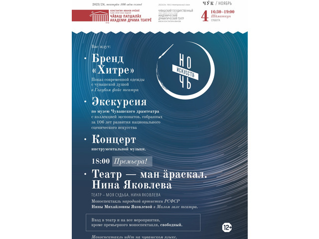 Чӑваш патшалӑх академи драма театрӗнче «Искусство каҫӗ-2023» культура мероприятийӗ иртӗ. Вӑл чӳк уйӑхӗн 4-мӗшӗнче, шӑматкун, 16:30 сехетре пуҫланӗ.